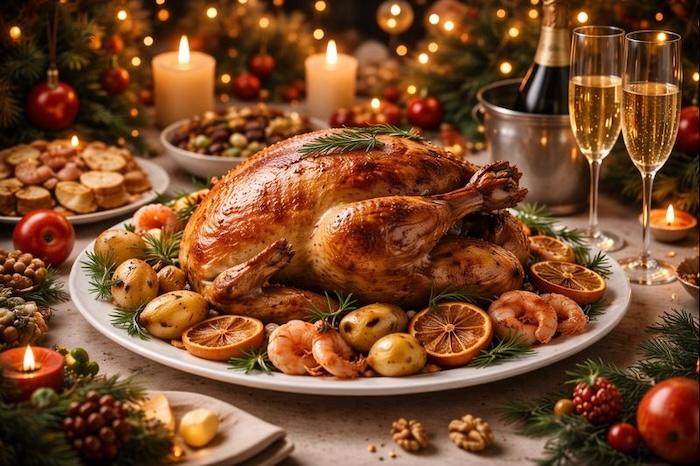 Een klassiek Spaans kerstgerecht is pavo asado (gebraden kalkoen), al kiezen steeds meer gezinnen tegenwoordig voor variatie. Vooral mariscos (zeevruchten) zijn populair, met onder andere langostinos (grote garnalen) als favoriet.
