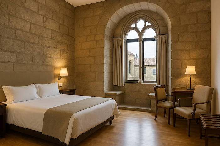Santiago de Compostela biedt een breed scala aan overnachtingsmogelijkheden, van eenvoudige pelgrimspensions tot sfeervolle boetiekhotels en historische kloosters. In het hart van de oude stad vind je traditionele accommodaties in eeuwenoude gebouwen met uitzicht op de kathedraal, zoals Hotel San Miguel of Pousadas de Compostela. Voor wie iets buiten het centrum verblijft, zijn er moderne hotels met ruime kamers en parkeergelegenheid. Richtprijzen variëren van ongeveer 40 euro voor een eenvoudig pension tot 120 euro voor een comfortabel hotel. Een bijzondere ervaring is overnachten in het monumentale Parador de Santiago, waar kamers vanaf ongeveer 180 euro per nacht beschikbaar zijn.